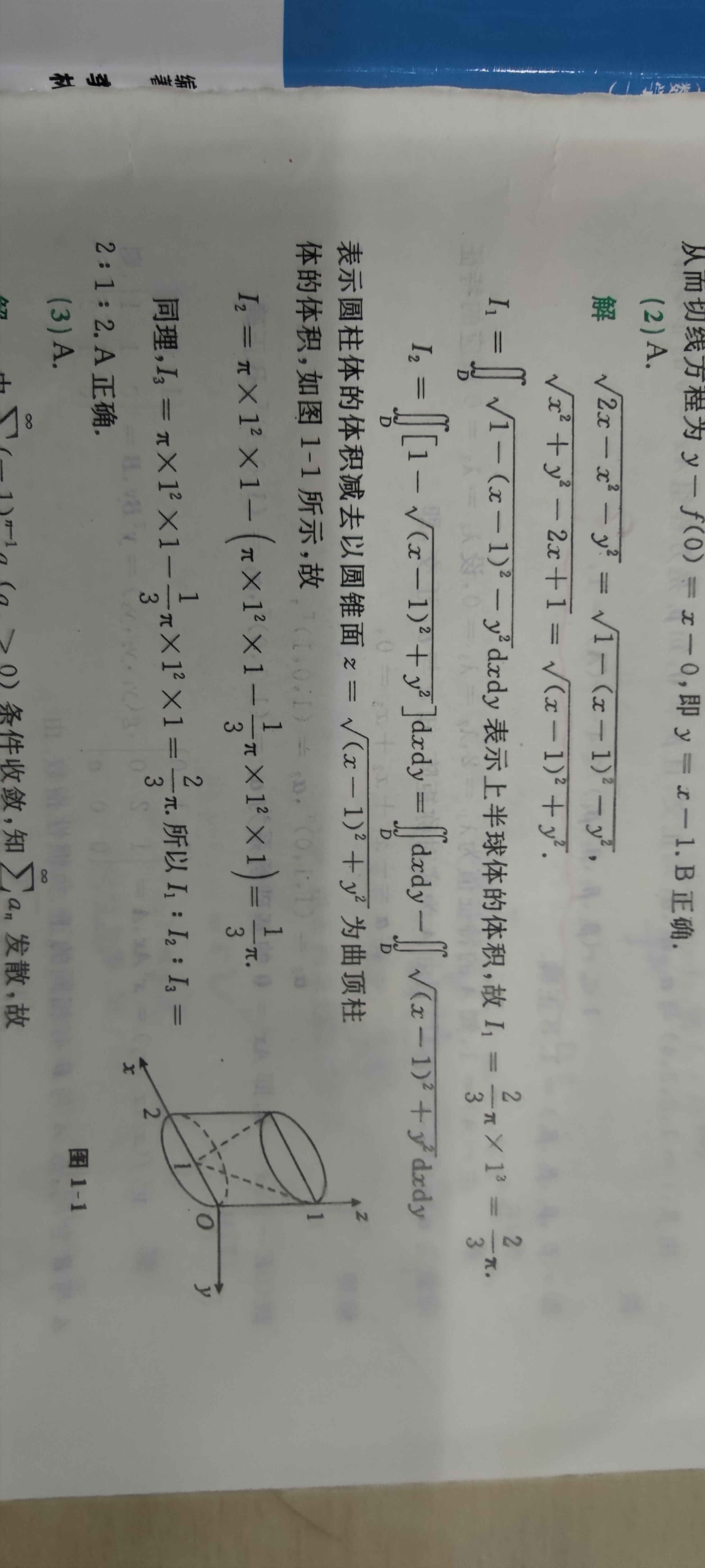 这个第二题,那个倒立的圆锥的体积不是π/3吗,为啥I2是π/3,I3是2π/3