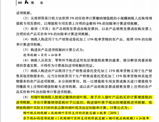 那如果烟丝适用计算扣除的话,按照农产品计算扣除的办法规定不应该是用单位成本*销售数量*1-损耗率*1+税率/税率么?--------购进烟叶准予抵扣的增值税进项税额,按照收购烟叶实际支付的价款总额和烟叶税及法定扣除率计算。计算公式为: