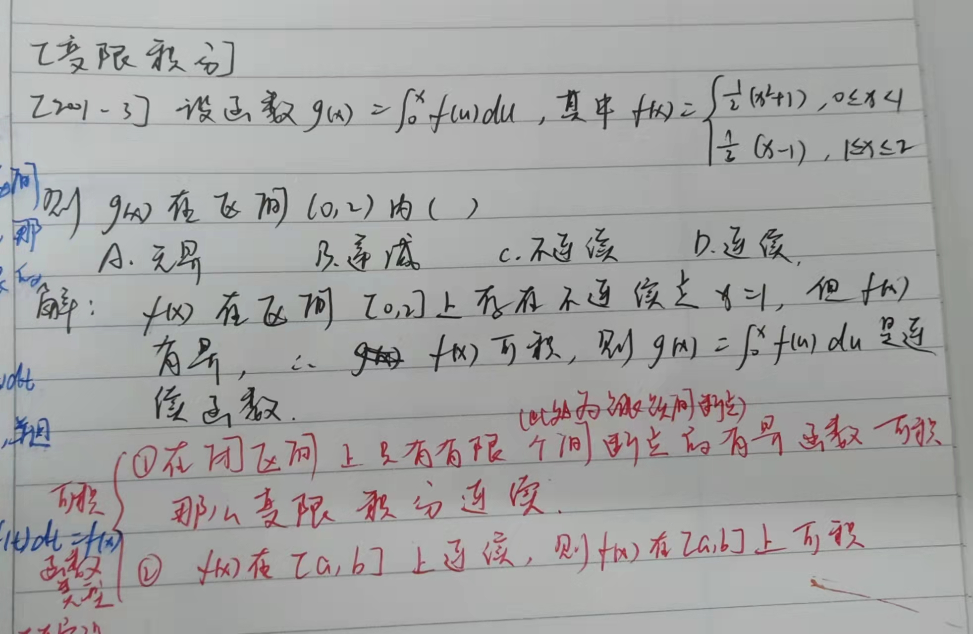 老师你好,可积说明积分连续对吗?请问变限积分连续 是不是不能说明变限积分有对应的原函数。在此题中,被积函数并不连续(有第一类间断点),说明无原函数,但可积。