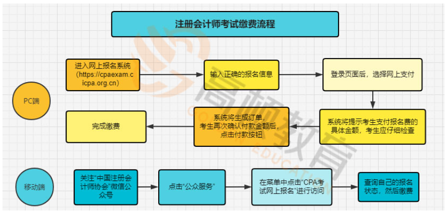电脑端:考生访问中国注册会计师协会官方网站,点击进入网报系统,输入正确的报名信息,正式进入网报登录页面;登录页面后,选择网上支付。届时,系统将提示考生支付报名费的具体金额,考生应仔细检查;系统将生成订单,考生再次确认付款金额后,点击付款按钮。